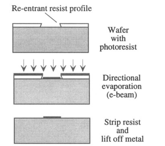 lift-off: When metal is etched with patterns and the resist(photoresist and metal on it) is stripped, the matal on top of the resist is "lifted-off"</p>