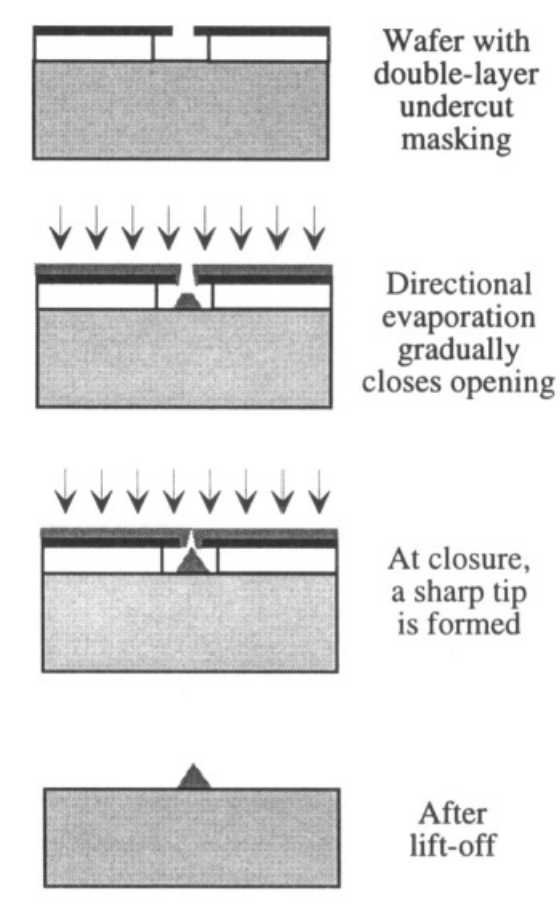 It exploits the deposition of the evaporated metal onto the edges of the masking layer, gradually closing off the opening.The evaporated layer at the substrate becomes conical in shape, finally reaching a sharp point when the masking layer closes off completely.(Spindt Process)