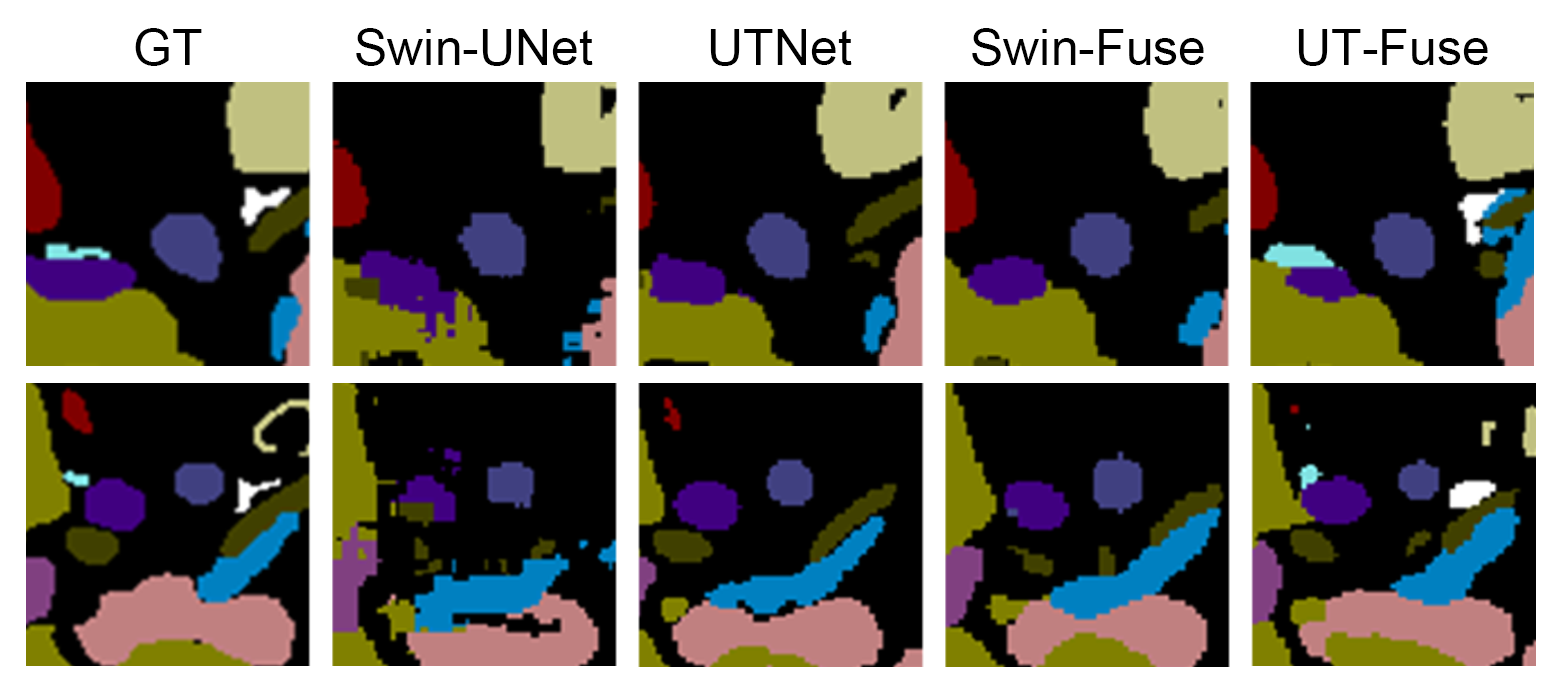 The performance of UT-Fuse is generally better than almost all other models, however, it is inferior to UTNet in several classes. An interesting observation is that both Res-UNet and UTNet have higher DICE scores for gallbladder than UT-Fuse even though UT-Fuse is composed of these two models. This problem is possibly caused by the unclear boundary of gallbladder with other organs, when the BiFusion module fusing two separate models, information captured by lower layers are mixed up, which makes the model harder to separate Gallbladder and other organs.