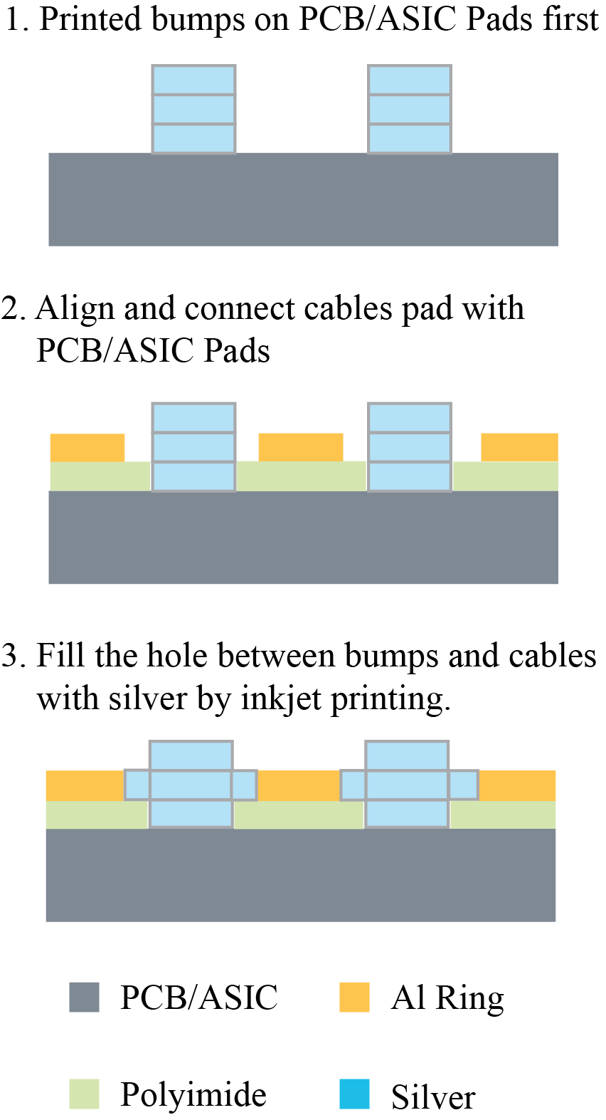 Among all electrical connection techniques, flip-chip bonding is a commonly used method including bonding with anisotropic conductive films (ACF) etc. [1] </a > < a id = ``ref1'' > </a > However, ACF needs high temperature, high pressure, and high cost to fabricate. Therefore, developing a feasible, reliable, and high-throughput method to bond flexible probe and CMOS circuits together is necessary. There are a few prospective methods such as inkjet printing. [2] nkjet is gaining importance due to the ease of deposition on 3D and high resolution, which is a potential bonding method for hybrid integration of flexible probe and CMOS circuits. By introducing inkjet printing, the throughput of bonding would be greatly improved.