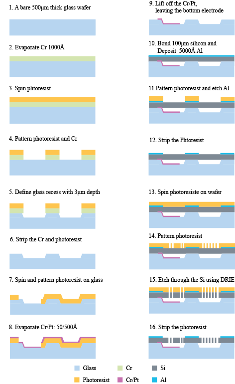 In the last step, photoresist works as the protection layer for Si wafer in the DRIE process. Finally, the photoresist is removed and the MEMS stage.