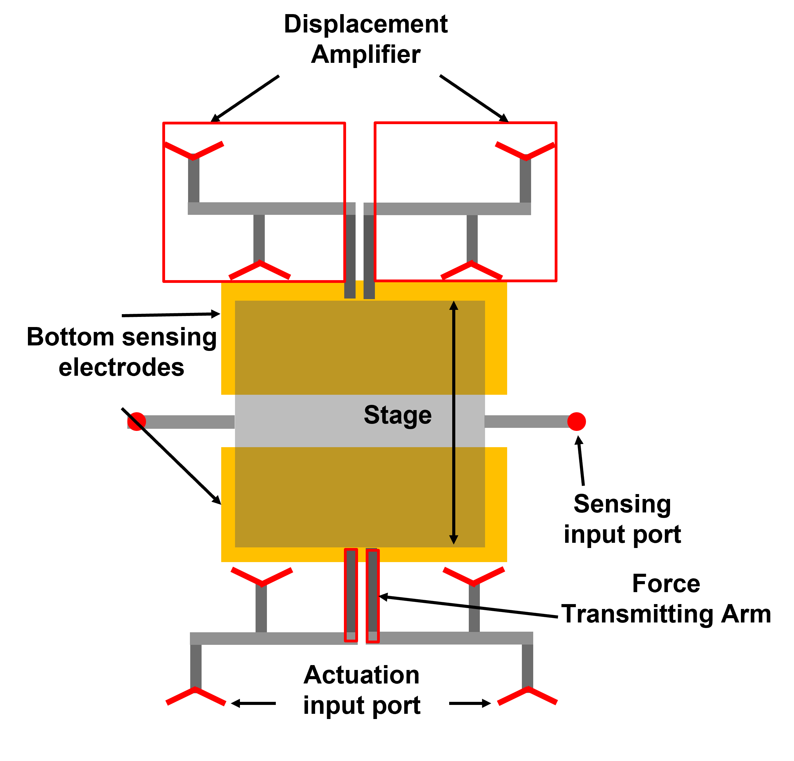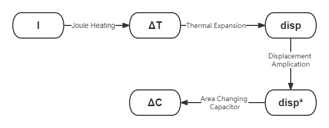 The working principle of the MEMS device is that an input current(I) is applied at the actuation port on the thermal actuators.The Joule heating caused by the current will create a temperature change.($\Delta T$) This will lead to a displacement(disp) due to the thermal expansion of the the actuators. The displacement amplifying arms that are connected to the thermal actuators are used to amplify the thermal displacement and will transmit the amplified displacement(disp*) on the center stage through the force transmitting arms. In the end, the position changes of the center stage due to the thermal actuation will lead to a change in the overlap area between the center stage and bottom sensing electrodes. With the center stage serving as one part of the parallel plate capacitor, and the bottom sensing electrodes serving as the other part, the change in capacitance can be sensed. The whole process will be shown in Fig. 3.