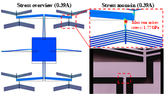 Lastly, the breakage of the devices is shown in Fig 14. A mechanical failure was visible at the connecting hinge between the actuating chevrons and the displacement amplifying arm when the current was larger than 0.39A. To verify this breakage, the simulation result also showed that the stress was concentrated at the same location in which breakage was observed to occur. From the simulation result.