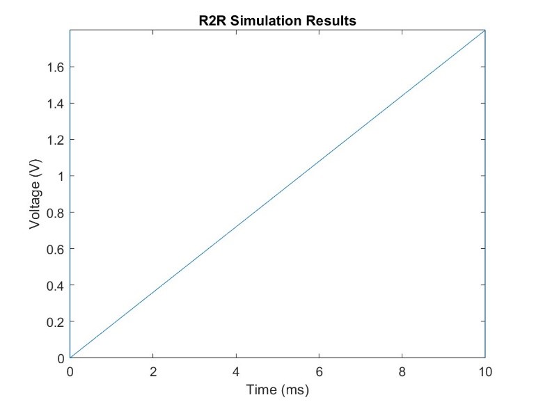 The DAC uses an R2R ladder due to its simplicity and ease of implementation. This consideration also provides a clean signal with low power consumption. Fig 11. shows the simulation results for the R2R ladder. The DAC can supply 256 evenly spaced voltage levels, corresponding to 256 discrete stage positions.