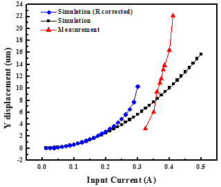 Furthermore, in Fig 13. shows the displacement of the center stage changes as the currents increase. As the input current changes from 0.3A to 0.4A, the center stage deforms by 3.33 $\mu m$ to 22.2 $\mu m$ with the breakage occurring at 0.39 A with displacement of 13.9 $\mu m$. Due to the lower measured resistance of the chevron, compared to the simulated resistances, a larger input current is required to displace the center stage. This results in a right shifted measured displacement curve in red compared to the R-corrected simulation displacement curve in blue.
