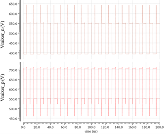 The output waveform shows in Fig. 9. is the AC simulation of the mixer. By comparing two inputs, the output is the results from the capacitance change. From the simulation results, Linearity and enough amplification could be told.
