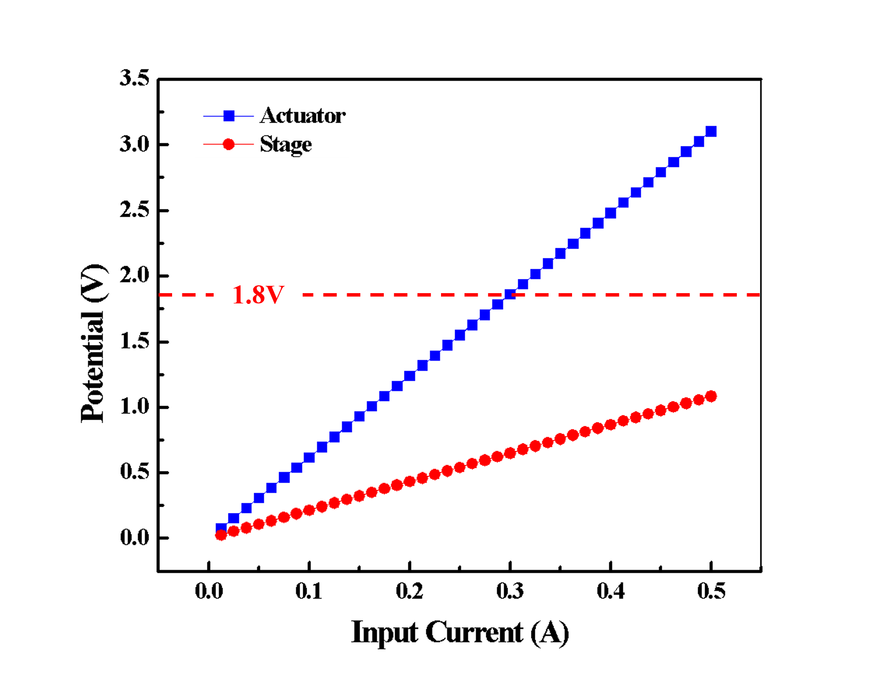 Electrical analysis was also conducted to ensure the potential drift at the center stage was under acceptable level. There are two main causes leading to the electrical potential value of the stage during actuation: (1) MEMS structure is not electrically isolated different components (The structure is not only mechanically, but also electrically connected) (2) Stage is one part of the sensing electrode and play a important role in sensing circuit. A large potential drift during actuation may drive the circuit bias out of working range. The simulation results in Fig 5 shows that the stage potential is affected by input current. However, the potential can be kept under 1.8V of the interface circuit within the driving range of 0.5A.(Two pads drive one chevron.)