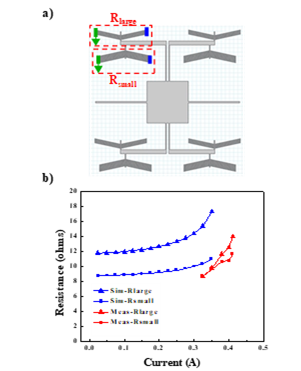 Fig 12 a) Schematic of two types of chevron design, respectively with resistance $R_{large}$ and $R_{small}$ and, b) measurement and simulation results of resistances of a single chevrons for $R_{large}$ and $R_{small}$
