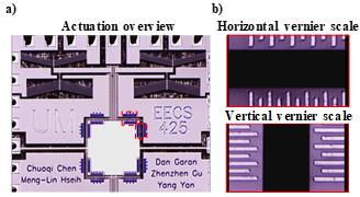 Fig 11. - a) Micrograph overview of the fabricated MEMS devices, and b) zoom-in micrographs of the horizontal and vertical vernier scales used for measuring stage displacement.