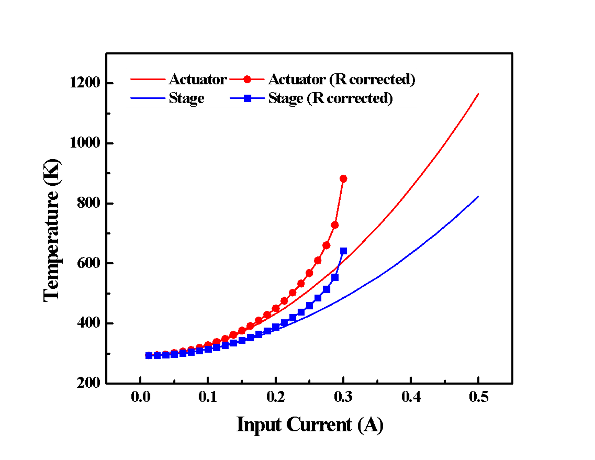 Thermal analysis was conducted in COMSOL to ensure that thermal actuators were operating at a tolerable temperature. Naturally, the higher temperature the actuators are, the more thermal expansion and thus displacement the device will be able to achieve. Based on the maximum operating temperature of around 1000K for a similarly designed thermal actuator in paper, we aimed to design the stage maximum operating temperature of 1000K. Fig 4 shows the temperature simulation results of the actuator and the stage. The square and circle-labeled lines show the simulation results with a temperature-correct conductivity for silicon. Based on these results, nonlinear increase in temperature with respect to an increase in input current. The maximum temperature can be reached within the current limit in this design.